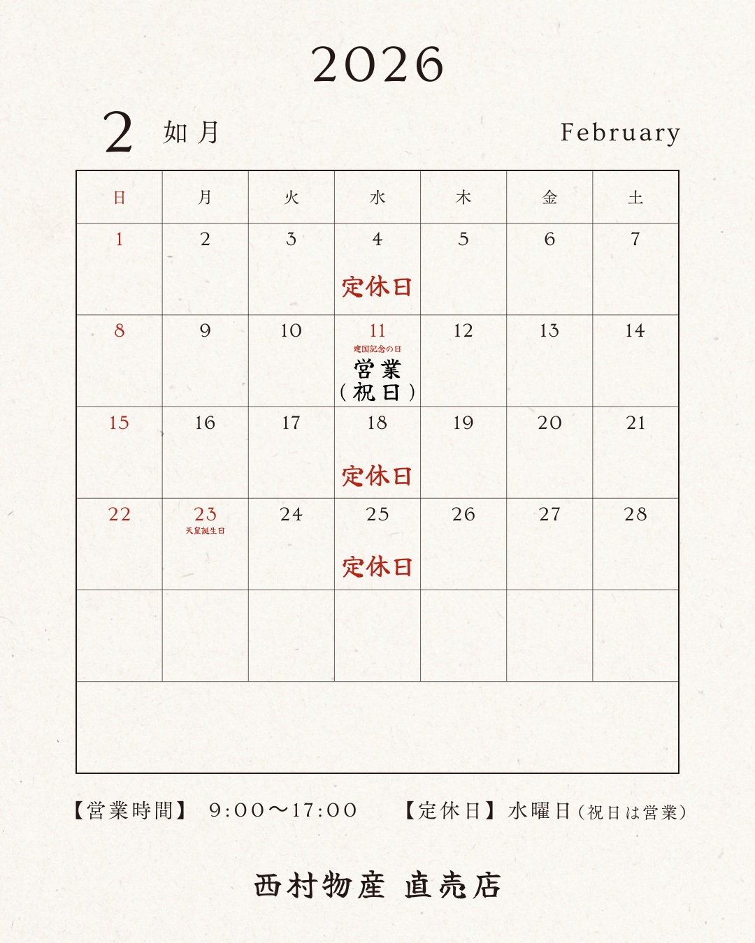 【直売店】2月 営業日のお知らせ 西村物産 直売店の2026年2月の営業日のご案内です。 土日、祝日も営業しております。毎週水曜は定休日です。 なお、2月11日(水)は祝日により営業しております。 オンラインストアは常時営業しております、是非ご利用ください。