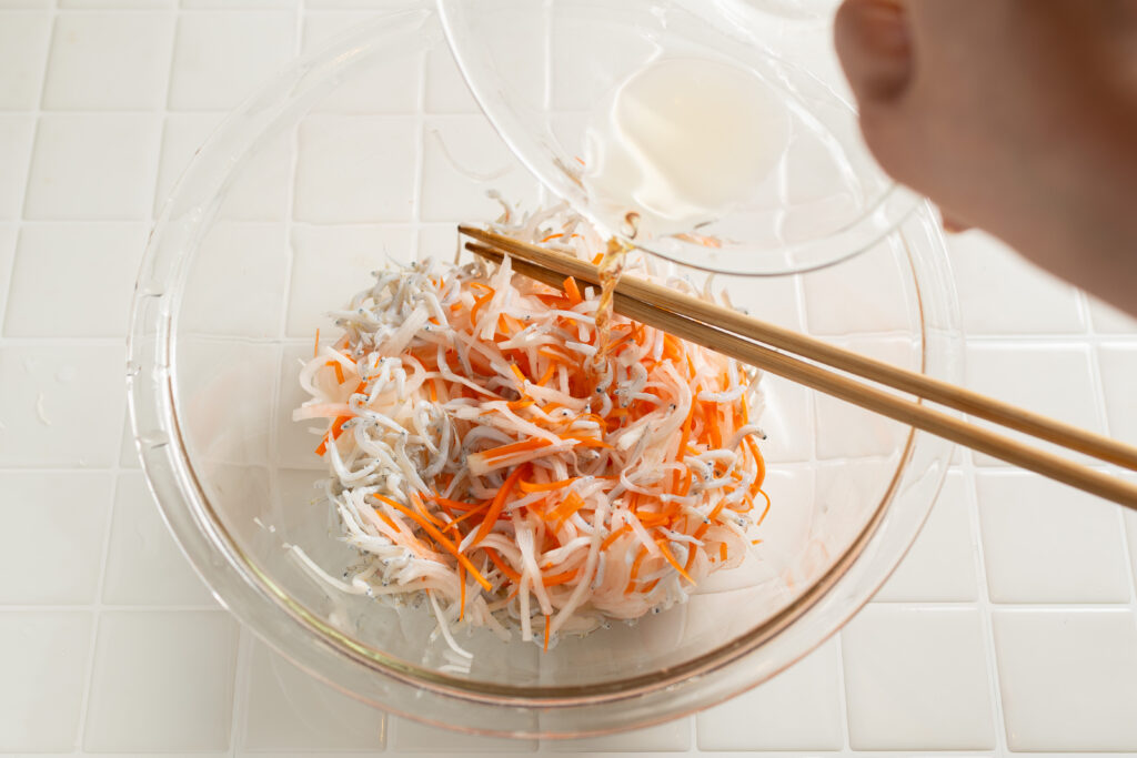 ⑤ ③に釜揚げしらす、合わせ酢を入れてさっくりと和え、冷蔵庫で20分ほど置いて味をなじませる。