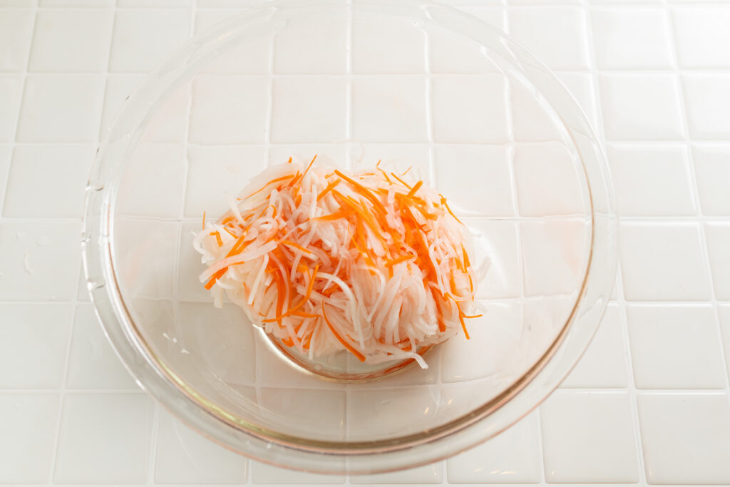 ② ボウルに大根とにんじんを入れ、塩を振って軽く揉み、10分ほど置く。