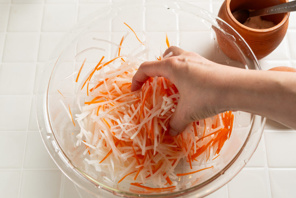 ・ しんなりした大根と人参をしっかり絞るのが、水っぽくならないコツです。